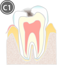 虫歯がエナメル質の内側の象牙質に達したものです。象牙質はエナメル質により軟らかい組織なので、虫歯の進みかたが速くなります。 C1 と同様に合成樹脂(レジン)を充填するか、範囲が大きい場合は削ったあとに歯型を取り、金属やセラミックの詰め物(インレー)を作り、欠損部を修復します。