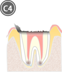 歯冠が溶けて無くなり、根の部分だけが残っている状態です。 C3の場合と同様に治療し被せ物をするか、やむを得ない場合は残った歯根部を抜歯します。 抜歯した部分は傷が治った後に、ブリッジ・部分入れ歯・インプラントなどの方法で補うことになります。